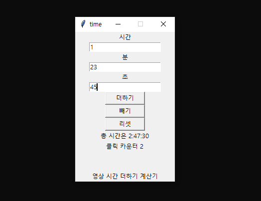 label3=tkinter.Label(window, text="영상 시간 더하기 계산기")